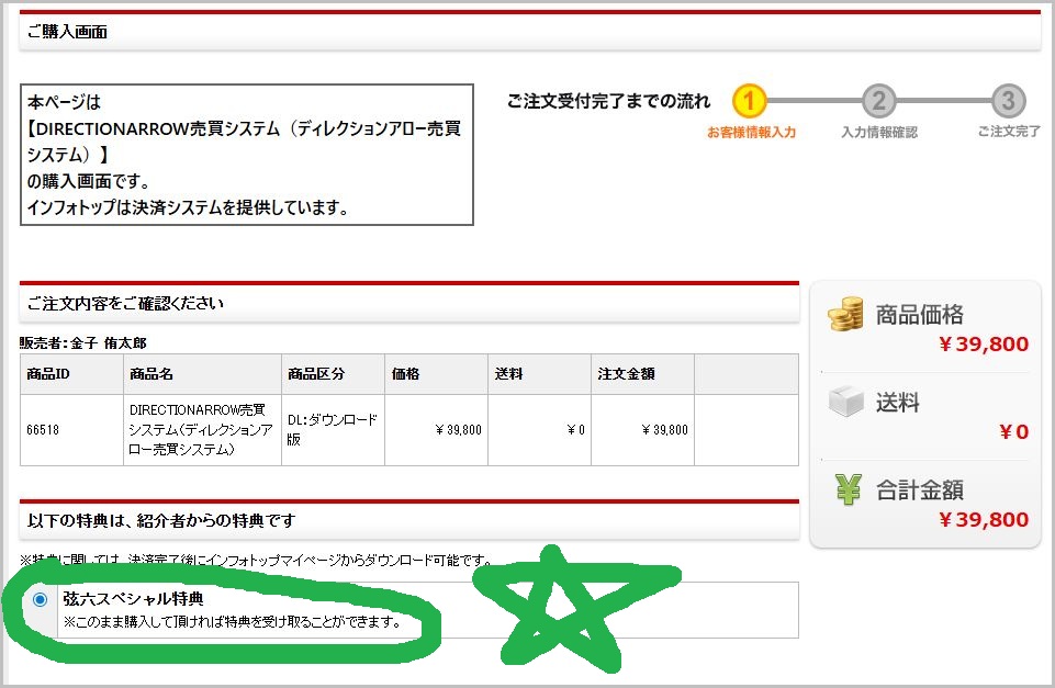 弦六経由で「ディレクションアロー売買システム」を購入される方は、以下のように特典が表示されるかご確認のうえ、購入をお願いします。
